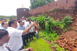 घेरा यशवंतगड किल्ल्याची भिंत पावसात कोसळली; आमदार किरण सामंत यांचा दौरा, निकृष्ट कामावर संताप