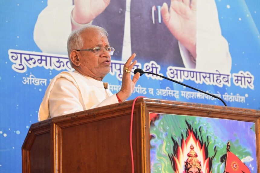 निसर्ग आपल्या हातात नाही. मात्र अस्मानी आणि सुलतानी संकटांची तीव्रता कमी करण्यासाठी आध्यात्मिक सेवांशिवाय पर्याय नाही. त्यामुळे सेवेकऱ्यांनी आता स्वामी महाराज आणि भगवतीची जास्तीत जास्त सेवा करावी असे आवाहन अखिल भारतीय श्री स्वामी समर्थ सेवामार्गाचे प्रमुख परमपूज्य गुरुमाऊली श्री आण्णासाहेब मोरे यांनी केले तेव्हा हजारो सेवेकर्यांनी टाळ्यांचा प्रचंड कडकडाट आणि जयजयकार करून गुरुमाऊलींना प्रतिसाद दिला.