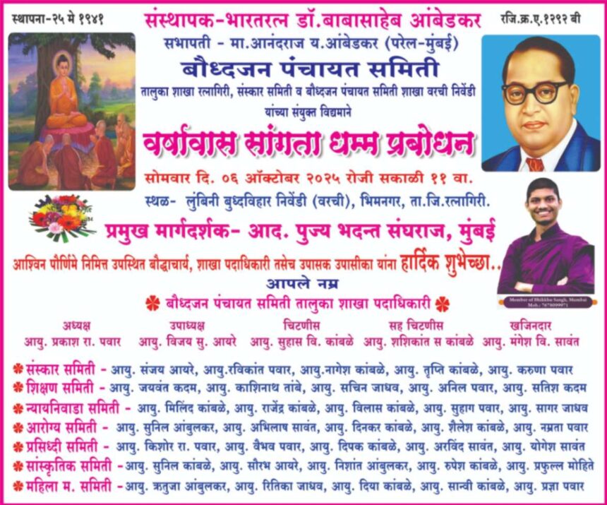 बौद्धजन पंचायत समिती तालुका शाखा रत्नागिरी, संस्कार समिती आणि बौद्धजन पंचायत समिती शाखा क्रमांक १८ निवेंडी वरची भीमनगर यांचे संयुक्त विद्यमाने सोमवार दिनांक ६ ऑक्टोबर २०२५ रोजी सकाळी ११ वाजता लुंबिनी बुद्ध विहारात वर्षावास सांगता धम्म प्रबोधन कार्यक्रमाचे आयोजन करण्यात आले आहे. या सांगता कार्यक्रमामध्ये मुंबई येथील बौद्ध धम्मगुरु भदंत संघराज यांच्या विशेष धम्मदेसनेचे प्रवचन होणार आहे. तर हा कार्यक्रम निवेंडी गावशाखेचे अध्यक्ष चंद्रकांत कदम यांचे प्रमुख अध्यक्षतेखाली होणार आहे.