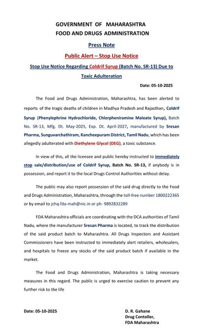 FDAने स्पष्ट केले आहे की मध्यप्रदेश आणि राजस्थानमध्ये काही मुलांच्या मृत्यूची दुर्दैवी घटना Coldrif Syrup (Phenylephrine Hydrochloride, Chlorpheniramine Maleate Syrup) शी संबंधित असल्याचे दिसून आले आहे. संदर्भित Batch No. SR-13, मे 2025 मध्ये तयार, एप्रिल 2027 पर्यंत वैध, Sresan Pharma, Tamil Nadu यांनी तयार केलेले आहे. या सिरपमध्ये विषारी Diethylene Glycol (DEG) असल्याची शक्यता व्यक्त करण्यात आली आहे.