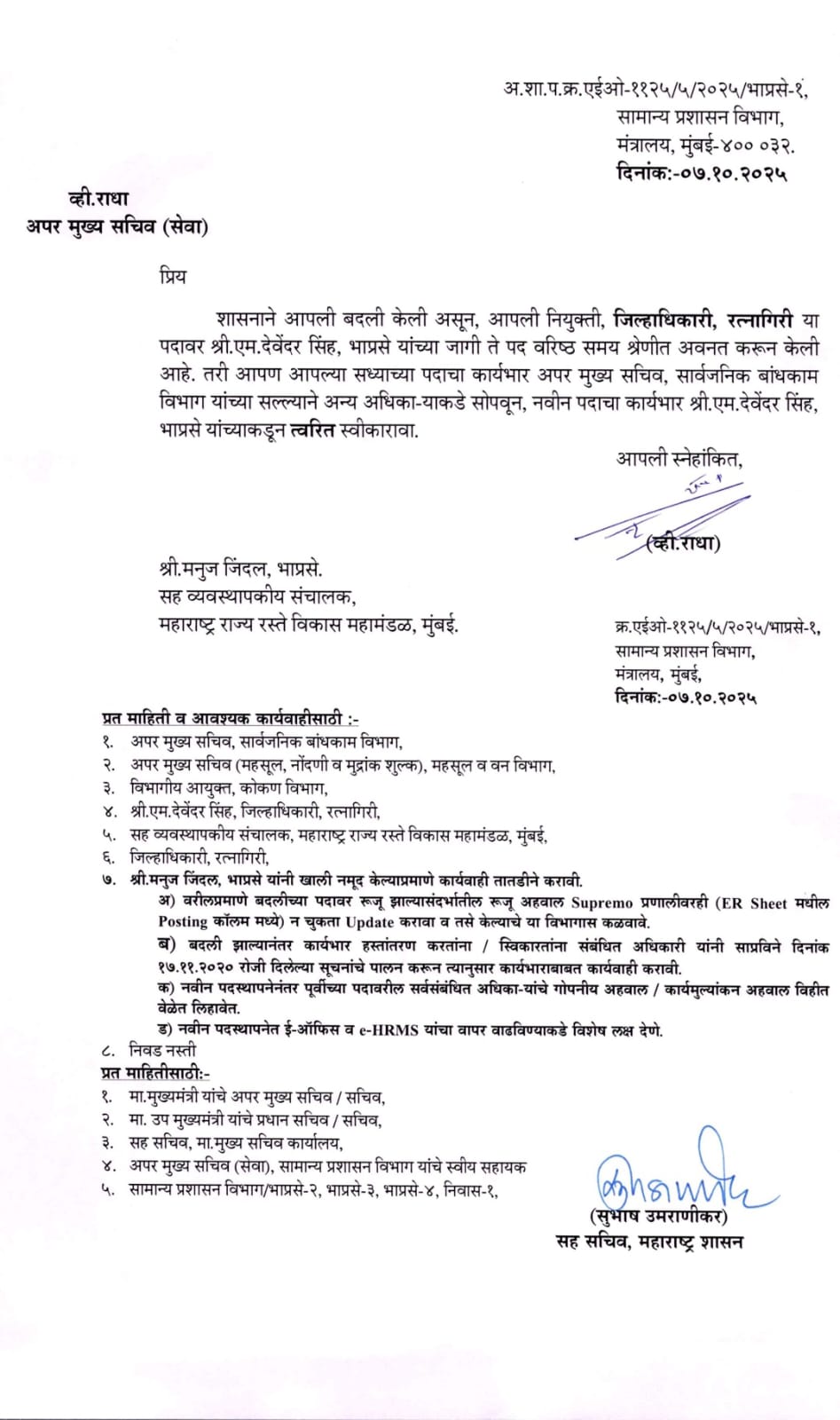 रत्नागिरी जिल्ह्याचे जिल्हाधिकारी म्हणून यशस्वी कामगिरी केलेले एम. देवेंद्र सिंग (IAS) यांची बदली झाली असून, त्यांची नियुक्ती सदस्य सचिव, महाराष्ट्र प्रदूषण नियंत्रण मंडळ, मुंबई या पदावर करण्यात आली आहे. त्यांच्या जागी महाराष्ट्र राज्य रस्ते विकास महामंडळ, मुंबई येथील सहसंचालक मनुज जिंदल (IAS) यांची रत्नागिरी जिल्हाधिकारी म्हणून नियुक्ती करण्यात आली आहे.
