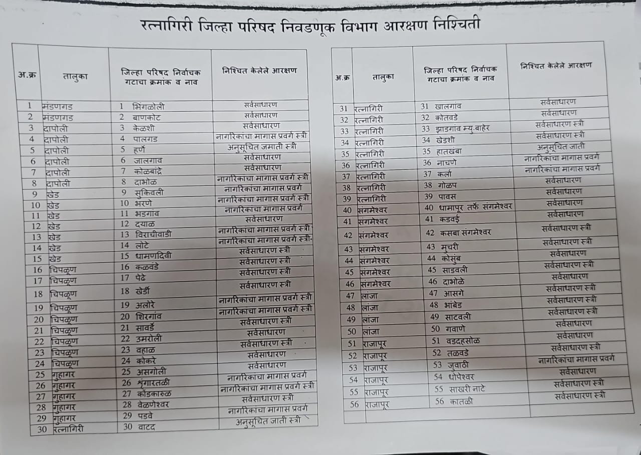 रत्नागिरी जिल्हा परिषद निवडणुकीच्या पार्श्वभूमीवर या आरक्षण यादीनंतर राजकीय घडामोडींना वेग येण्याची शक्यता व्यक्त केली जात आहे.