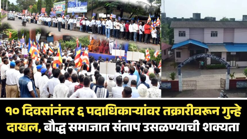 तालुक्यात थिबा राजाकालीन बुद्ध विहार बचाव संघर्ष समितीच्या वतीने बौद्ध समाजात ढवळून निघत असलेले वातावरण दिनांक 27 ऑक्टोबर रोजी काढण्यात आलेल्या विराट मोर्चामधून शासन- प्रशासनाच्या समोर आले. हा मोर्चा यशस्वी होऊन तब्बल दहा दिवस उलटल्यानंतर मोर्चादरम्यान करण्यात आलेल्या कथित आक्षेपार्ह आणि प्रक्षोभक वक्तव्यांप्रकरणी कळझोंडी येथील प्रमोद प्रकाश पवार यांच्या तक्रारीवरून पोलिसांनी संघर्ष समितीच्या सहा जणांवर गुन्हे दाखल केले आहे. या कारवाईमुळे आता पुन्हा समाजात प्रचंड संताप उसळण्याची शक्यता आहे.