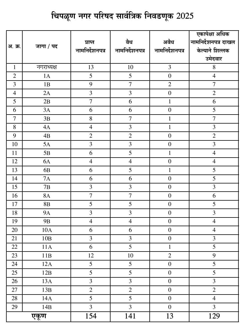 चिपळूण नगरपरिषद सार्वत्रिक निवडणुकीसाठी २ डिसेंबर रोजी मतदान होणार आहे. या निवडणुकीसाठी काल १७ नोव्हेंबर ही उमेदवारी अर्ज दाखल करण्याची शेवटची तारीख होती. नगराध्यक्ष पदासाठी १३, तर नगरसेवक पदांसह मिळून एकूण १५४ उमेदवारी अर्ज दाखल झाले होते. एका पेक्षा जास्त उमेदवारी अर्ज दाखल केल्याने आता १२९ उमेदवार रिंगणात उरले आहेत. अर्ज मागे घेण्याच्या दिवशी नगराध्यक्ष व नगरसेवक पदाच्या खऱ्या लढती स्पष्ट होतील.