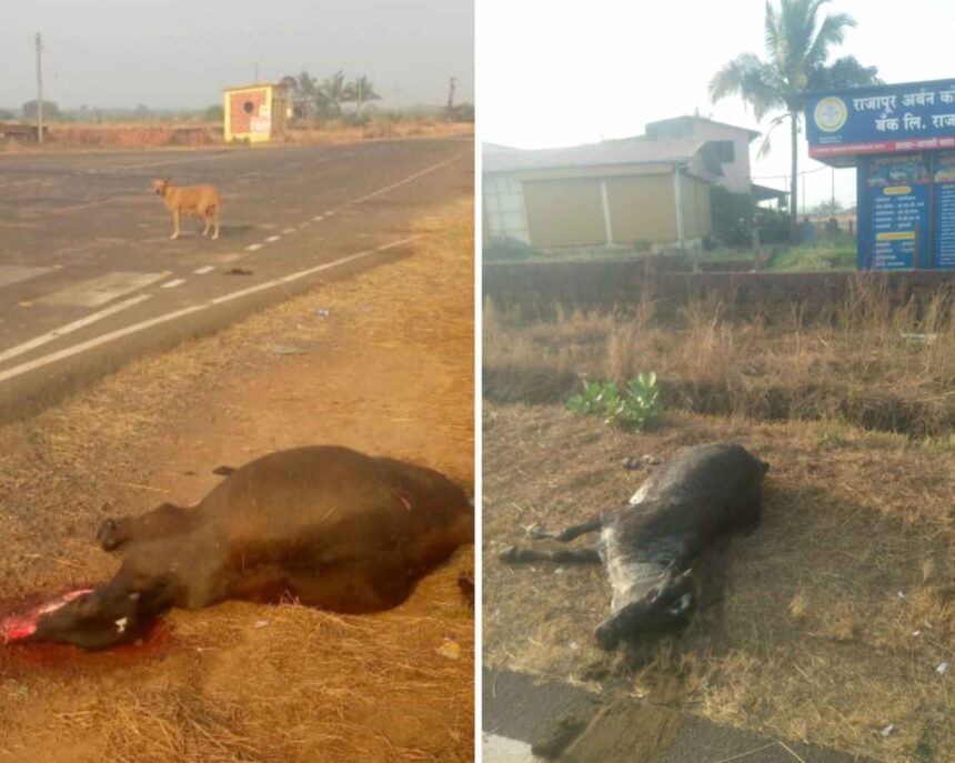 चिरेखन फाटा (ता. राजापूर) येथे दि. 26 नोव्हेंबर 2025 रोजी मध्यरात्री सागरी महामार्गावर अज्ञात वाहनाने दिलेल्या जोरदार धडकेत दोन मोकाट गाईंचा दुर्दैवी मृत्यू झाला. गेल्या अनेक महिन्यांपासून संपूर्ण राजापूर तालुक्यात मोकाट गुरांचा प्रश्न चिघळलेला असताना, या घटनेने स्थानिक प्रशासन व लोकप्रतिनिधींच्या निष्क्रियतेवर पुन्हा एकदा प्रश्नचिन्ह उभे केले आहे.