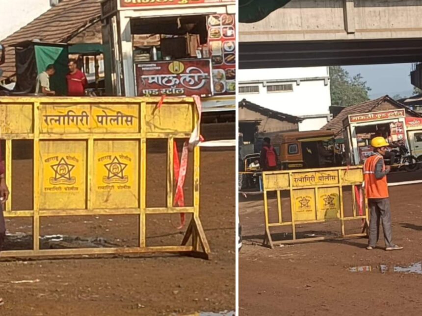 संगमेश्वर एसटी स्टॅंडसमोर सुरू असलेल्या राष्ट्रीय महामार्गाच्या कामात पोलिस प्रशासनाच्या मालकीचे बॅरिकेटर्स ठेकेदारच सर्रासपणे वापरत असल्याचे धक्कादायक वास्तव समोर आले आहे. वाहतूक सुरळीत करण्यासाठी आणि सुरक्षा व्यवस्थेसाठी पोलिसांना आवश्यक असणारी ही महत्वाची साधनेही आता ठेकेदारांच्या ताब्यात असून ती खासगी कामासाठी बिन्दास्तपणे वापरली जात आहेत.