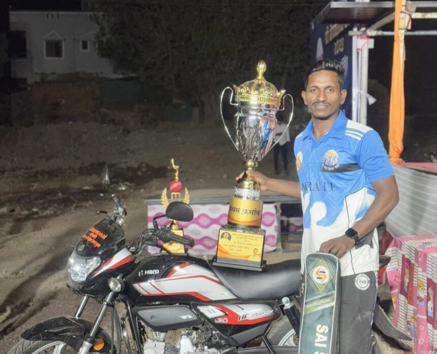 पुणे जिल्ह्यातील आढे येथील मैदानावर घेण्यात आलेल्या श्री भैरवनाथ चषक २०२५ च्या फूल पीच टेनिस बॉल क्रिकेट स्पर्धेत अतिशय उत्तमप्रकारे खेळी करत मालिकावीरचा बहुमानाचा किताब नायरा ११ संघाचा हुकमी एक्का सुमित पवार याने पटकाविल्याने त्याला हिरो होंडा (H.F.Dilux ) दुचाकी गाडी व भव्य चषक देऊन यथोचित गौरव करण्यात आला.