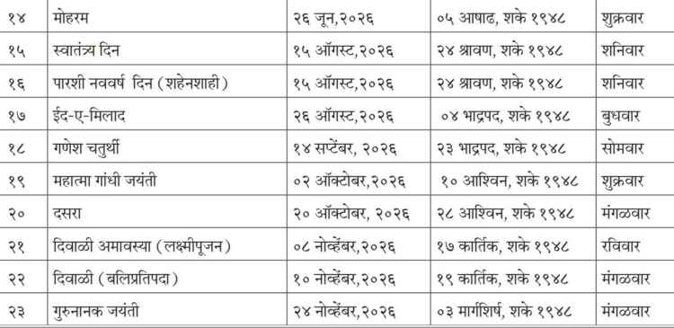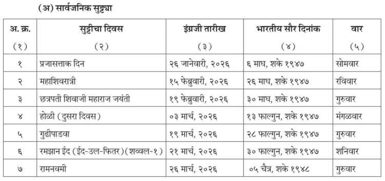 सामान्य प्रशासन विभागाने अधिसूचना प्रसिद्ध करताना सांगितले की, जाहीर सुट्ट्यांमध्ये प्रमुख राष्ट्रीय उत्सवांपासून धार्मिक सणांपर्यंत सर्व महत्वाचे दिवसांचा समावेश करण्यात आला आहे. यामुळे शासन कार्यालये, स्थानिक स्वराज्य संस्था, जिल्हा परिषद, पंचायत समित्या तसेच ग्रामपंचायतींना या सुट्ट्या लागू राहतील.