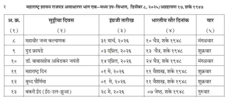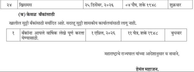 दरम्यान, 1 एप्रिल 2026 हा दिवस केवळ बँकांसाठी वार्षिक लेखापरीक्षणासाठी राखीव सुट्टी म्हणून घोषित करण्यात आला आहे. त्या दिवशी बँक व्यवहार बंद राहणार आहेत. शासन सुट्ट्यांची अधिकृत यादी लवकरच सर्व विभागांना पाठविण्यात येणार असून, कर्मचारी व नागरिकांना नियोजनासाठी ती उपयुक्त ठरणार आहे.