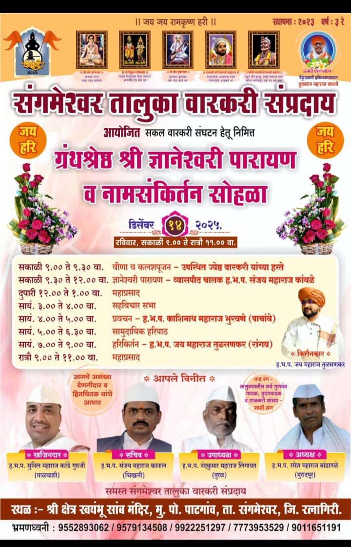 संगमेश्वर तालुका वारकरी संप्रदाय आयोजित ‘सकल वारकरी संघटन’ या उपक्रमांतर्गत ग्रंथराज ज्ञानेश्वरी पारायण व नामसंकीर्तन सोहळा रविवारी (१४ डिसेंबर) पाटगाव येथील श्री क्षेत्र स्वयंभू सांब मंदिरात भव्य प्रमाणात पार पडणार आहे. सकाळी ९ ते रात्री ११ या वेळेत दिवसभर विविध धार्मिक कार्यक्रमांचे आयोजन करण्यात आले आहे.