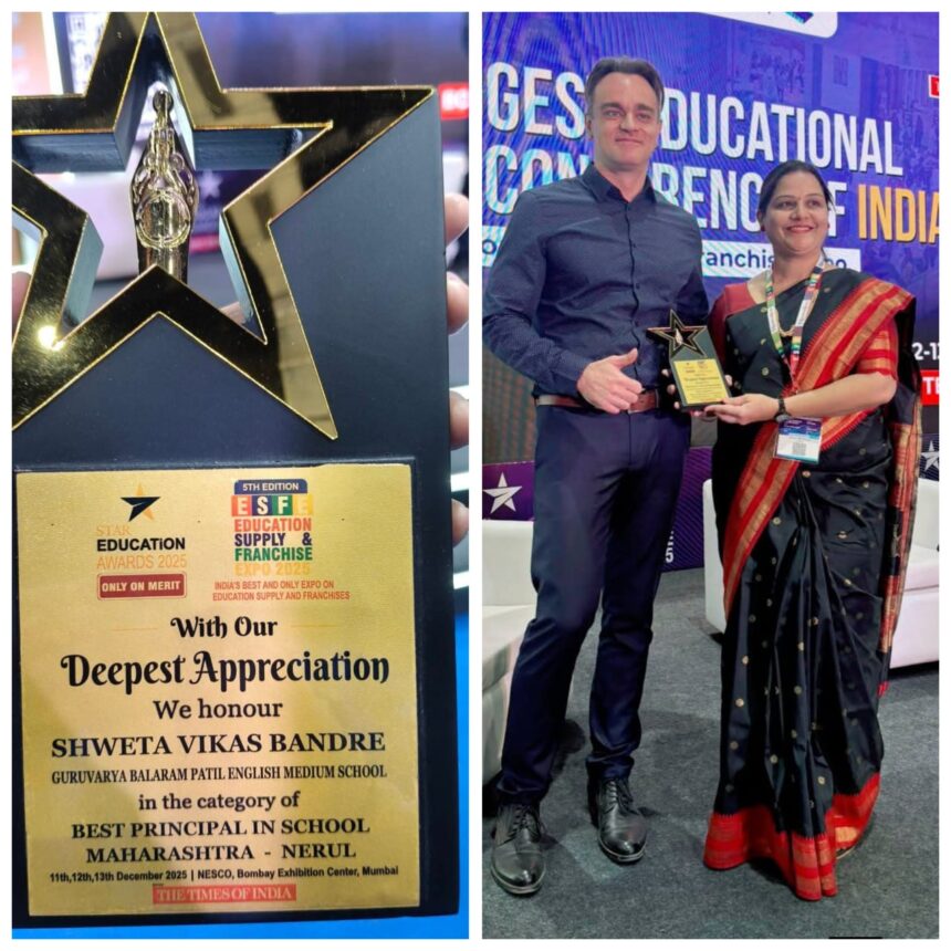 नेरुळ येथील गुरुवर्य बाळाराम पाटील इंग्लिश मिडीयम स्कूलच्या सौ. श्वेता विकास बंदरे यांना स्टार एज्युकेशनचा सर्वोत्तम मुख्याध्यापिका पुरस्कार देण्यात येवुन सन्मान करण्यात आला.