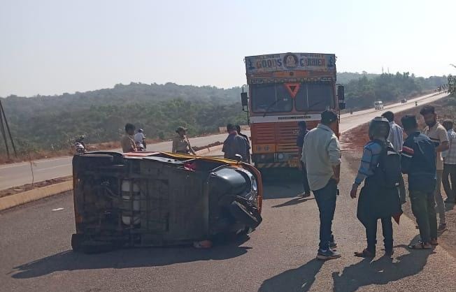 पालीकडून रत्नागिरीच्या दिशेने जाणारी रिक्षा (क्र. MH 08 BC 1219) यांना मागून येणाऱ्या ट्रकने (क्र. MH 08 AP 0711) जोरदार धडक दिली. धडकेचा जोर इतका तीव्र होता की रिक्षा रस्त्यातच पलटी झाली. या अपघातात रिक्षाचालकासह दोन प्रवासी किरकोळ जखमी झाले. तिथेच कॅम्पमध्ये असणारे आर टी ओ विभागाचे पोलिसांनी देखील मदतीसाठी घटनास्थळी धाव घेतली. पोलिसांसह स्थानिक नागरिकांनी जखमींना तत्काळ हातखंबा येथील जगद्गुगुरू नरेंद्र महाराज नाणीज धामच्या रुग्णवाहिकेमार्फत रत्नागिरी जिल्हा रुग्णालयामध्ये उपचारासाठी दाखल करण्यात आले.