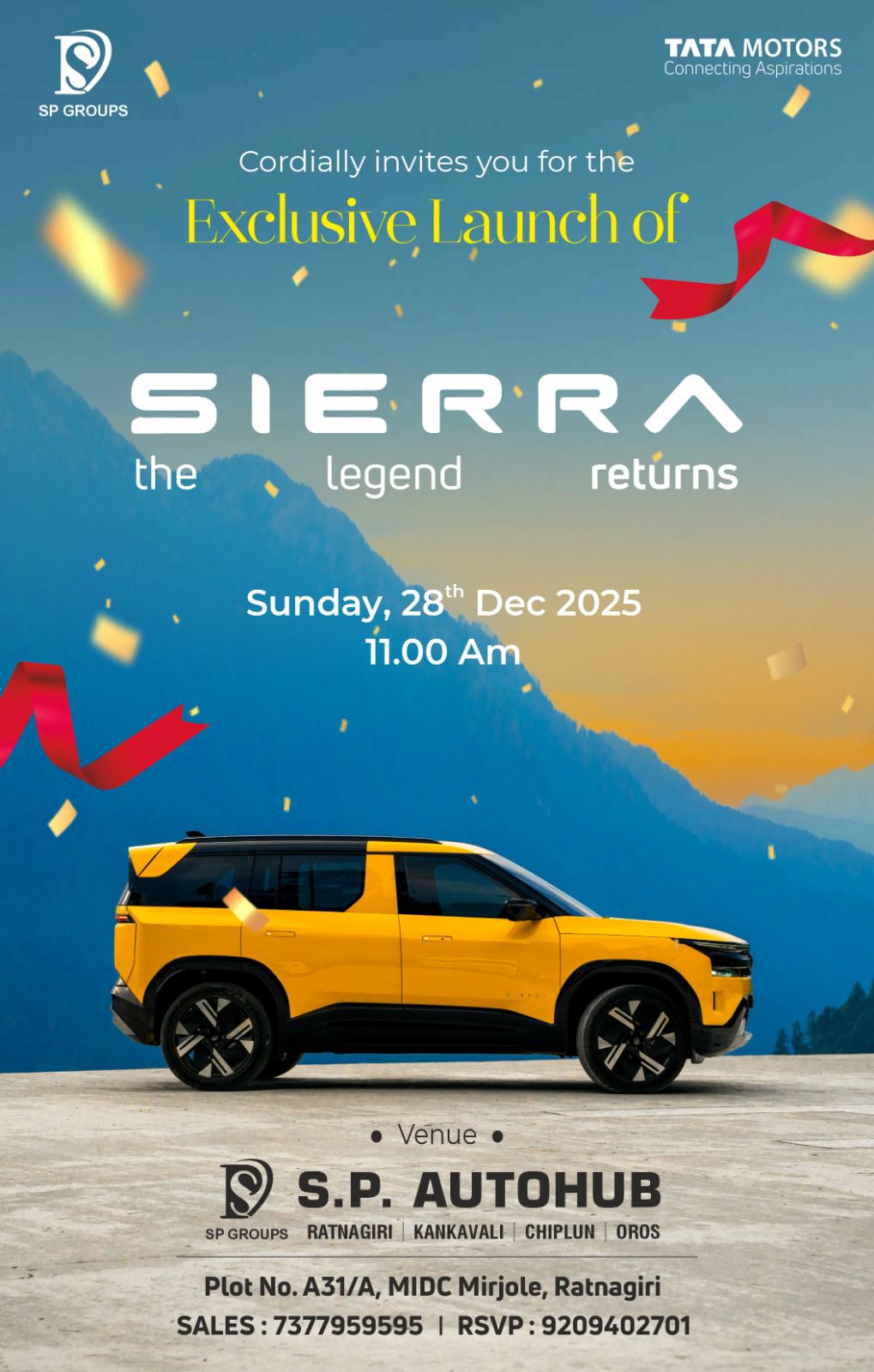 तसेच रविवार दिनांक 28/12/2025 रोजी एस पी ऑटोहब शोरूममध्ये टाटा सिआरा चे अनावरण होणार असून सकाळी १० वाजले पासून ग्राहकांना सिएरा बघण्यासाठी उपलब्ध करून देण्यात येणार आहे.ही कार सेगमेंटमधील अग्रगण्य वैशिष्टये व विविध पेट्रोल, डिझेल, फ्युएल व मॅन्यूअल,डीसीए,एएमटी ट्रान्समिशन पर्यायांसह सादर झाली आहे.
