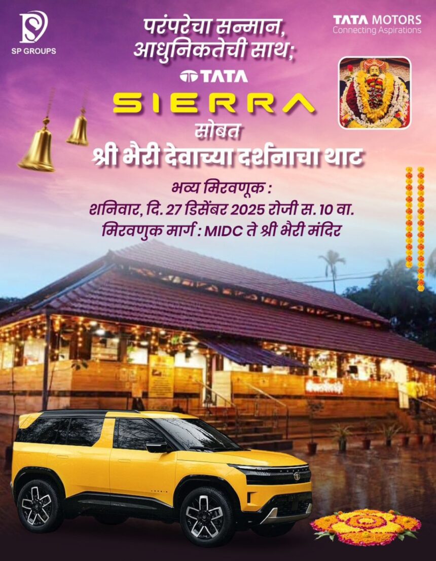 लॅांचिंग चे आधीच ग्राहकां कडून कौतुक करण्यात येत असलेल्या अत्यंत प्रतिक्षित “दि लिजेंड टाटा सिएरा” चे आज शनिवार दिनांक २७ डिसेंबर रोजी सकाळी १० वाजता श्री भैरी दर्शन मिरवणूक ची वाजतगाजत सुरुवात एस.पी.ॲाटोहब यांच्या रत्नागिरी येथील शोरुम पासुन होते आहे.