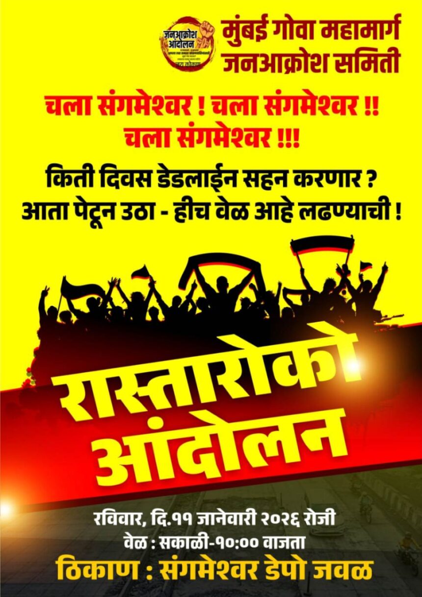 मुंबई–गोवा राष्ट्रीय महामार्गाचे काम तब्बल १७ वर्षांपासून रखडलेले असताना, शासन, प्रशासन आणि ठेकेदारांच्या निष्क्रियतेमुळे कोकणवासीयांचा संयम आता संपुष्टात आला आहे. वाढते अपघात, सततची वाहतूक कोंडी, धुळीचे साम्राज्य आणि प्रवाशांच्या जीवाशी सुरू असलेल्या खेळाविरोधात आता थेट रस्त्यावर उतरून संघर्ष करण्याचा निर्णय घेण्यात आला आहे.या जनभावनेचा उद्रेक म्हणून ‘मुंबई–गोवा महामार्ग जनआक्रोश समिती’ने ११ जानेवारी रोजी संगमेश्वर येथे रास्ता रोको आंदोलन पुकारले आहे.