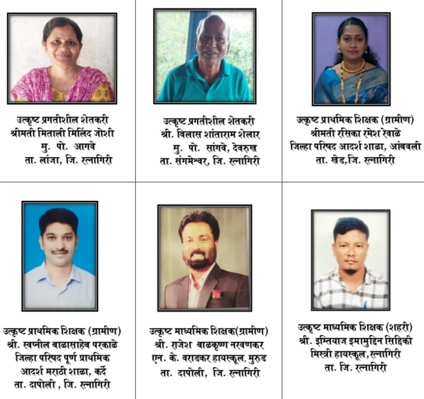 निवड समितीच्या शिफारशीनुसार सन २०२५/२६ साठी ‘उत्कृट प्राथमिक शिक्षक (ग्रामीण)’ हा पुरस्कार जिल्हा परिषद पूर्ण प्राथमिक शाळा, कर्दे, ता. दापोली, येथील प्राथमिक शिक्षक स्वप्नील बाळासाहेब परकाळे, तसेच जिल्हा परिषद आदर्श शाळा, आंबवली, ता. खेड, येथील प्राथमिक शिक्षिका सौ. रसिका रमेश रेवाळे यांना देण्यात आला आहे. ‘उत्कूट माध्यमिक शिक्षक (ग्रामीण)’ हा पुरस्कार एन. के. वराडकर हायस्कुल, मुरूड, ता. दापोली येथील शिक्षक राजेश बाळकृष्ण नरवणकर यांना प्रदान करण्यात आला आहे. तर मिस्त्री हायस्कुल रत्नागिरीचे इम्तियाज इमामुद्दिन सिद्दीकी यांना उत्कृट माध्यमिक शिक्षक (शहरी)’ या पुरस्काराने सन्मानित करण्यात येईल, सन २०२५/२६ साठी ‘उत्कृट प्रगतीशील शेतकरी’ म्हणून दोन शेतकच्यांचा सन्मान करण्यात येणार आहे. यामध्ये संगमेश्वर तालुक्यातील सांगवे गावचे विलास शांताराम शेलार आणि आगवे, ता. लांजा येथील महिला शेतकरी श्रीमती मिताली मिलींद जोशी यांचा समावेश आहे.