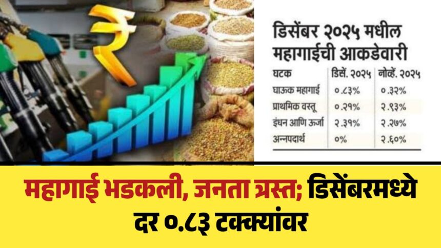 घाऊक महागाई दरात सलग दुसऱ्या महिन्यात वाढीचा कल कायम असून, डिसेंबर २०२५ मध्ये हा दर ०.८३ टक्क्यांवर पोहोचला आहे. अन्नपदार्थ, बिगर अन्न वस्तू तसेच उत्पादित मालाच्या किमतीत झालेल्या वाढीमुळे घाऊक मूल्य निर्देशांक (डब्ल्यूपीआय) आधारित महागाई दरात ही वाढ नोंदवली गेली आहे.