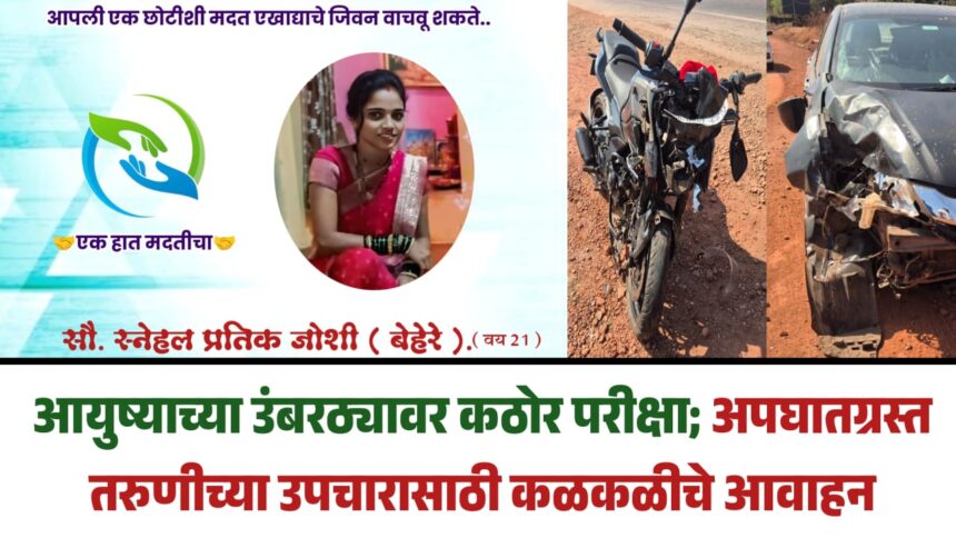 आयुष्य नुकतेच उलगडू लागलेल्या वयातच नियतीने कठोर परीक्षा घेतली आहे. लांजा तालुक्यातील आंजणारी येथील सौ. स्नेहल प्रतीक जोशी (बेहेरे) (वय २१) ही तरुणी मंगळवारी (ता. १३ जानेवारी २०२६) सकाळी सुमारे सात वाजण्याच्या सुमारास हातखंबा परिसरात झालेल्या भीषण अपघातात गंभीर जखमी झाल्या आहेत. या अपघातात त्यांच्या डोक्याला जबर मार बसला असून सध्या त्यांच्यावर कोल्हापूर येथील WIINS हॉस्पिटलमध्ये अतिदक्षता विभागात उपचार सुरू आहेत.