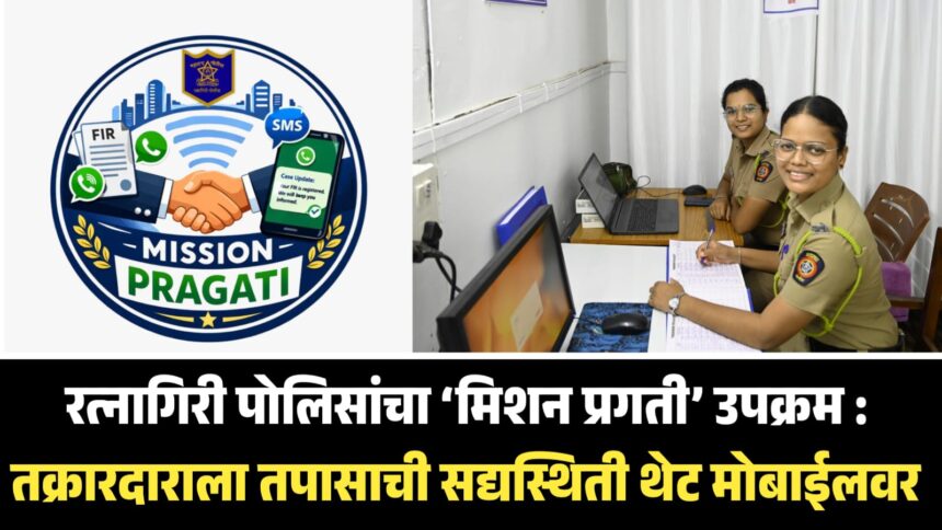 जिल्ह्यातील पोलीसिंग अधिक नागरिकाभिमुख, पारदर्शक आणि तंत्रज्ञानस्नेही करण्याच्या दिशेने रत्नागिरी जिल्हा पोलीस दलाने ‘मिशन प्रगती’ हा नाविन्यपूर्ण लोकाभिमुख उपक्रम सुरू केला आहे. मा. पोलीस अधीक्षक नितीन दत्तात्रय बगाटे यांच्या दूरदृष्टीच्या नेतृत्वाखाली हा उपक्रम १० जुलै २०२५ पासून अंमलात आणण्यात आला असून, यामुळे तक्रारदाराला आपल्या तक्रारीच्या तपासाची सद्यस्थिती थेट मोबाईलवर मिळू लागली आहे.