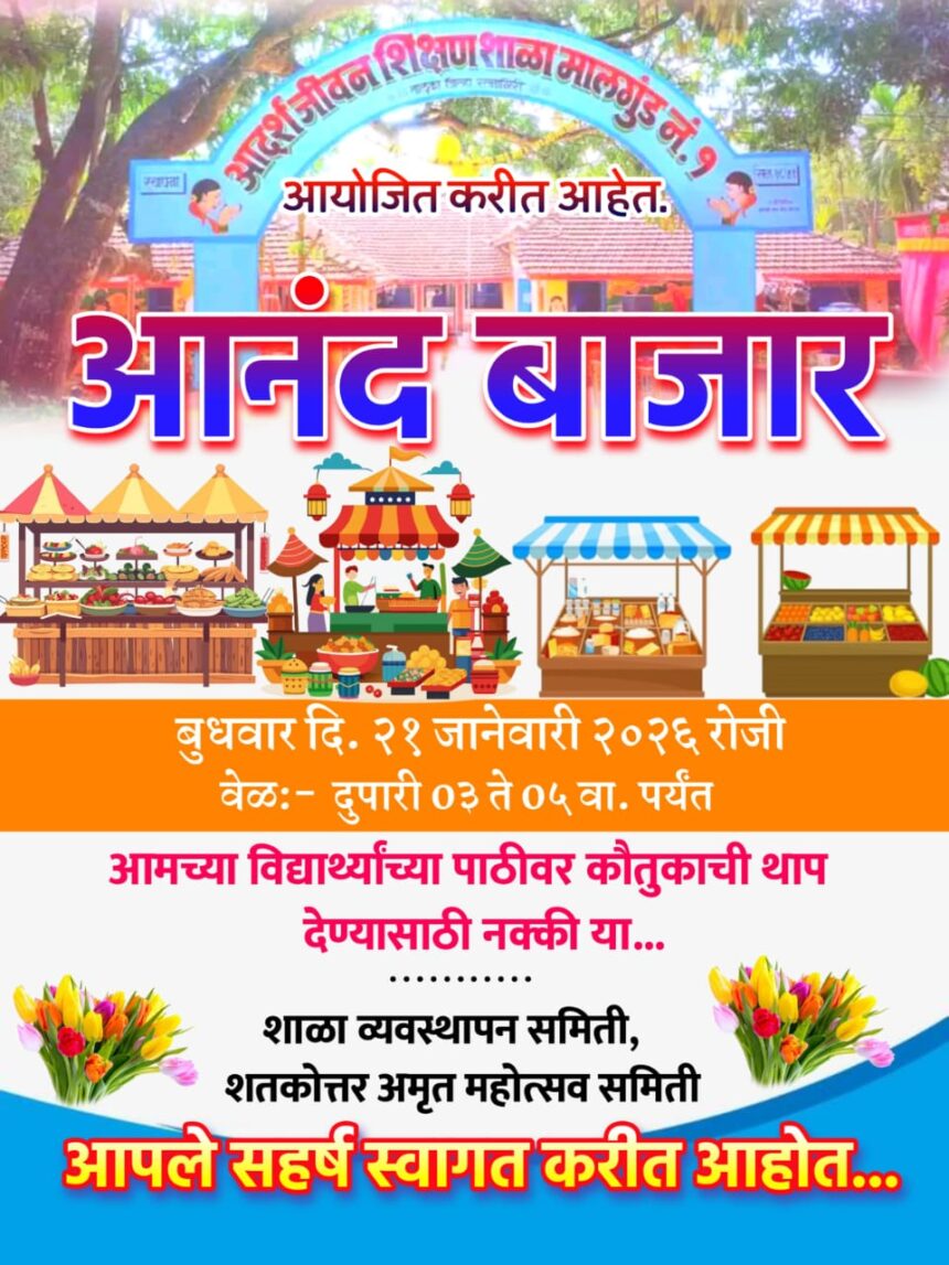रत्नागिरी तालुक्यातील मालगुंड येथील आदर्श जीवन शिक्षण शाळा मालगुंड नंबर १ मध्ये उद्या बुधवार दिनांक 21 जानेवारी रोजी दुपारी तीन ते सायंकाळी पाच या वेळेत “आनंदाचा बाजार “या आगळ्यावेगळ्या उपक्रमाचे आयोजन शाळा व्यवस्थापन समिती आणि शतकोत्तर अमृत महोत्सव समिती यांचे वतीने करण्यात आले आहे. मालगुंड येथील आदर्श जीवन शिक्षण मालगुंड नंबर एक शाळेचा शतकोत्तर अमृत महोत्सव यंदा विविध उपक्रम आणि भरगच्च कार्यक्रमांनी साजरा करण्यात येत आहे. त्या निमित्ताने विविध उपक्रम आणि कार्यक्रम शाळा व्यवस्थापन समिती आणि शतकोत्तर अमृत महोत्सव समितीच्या वतीने आखले जात आहेत. त्याचाच एक भाग म्हणून हा आगळा वेगळा उपक्रम आयोजित करण्यात आला आहे.
