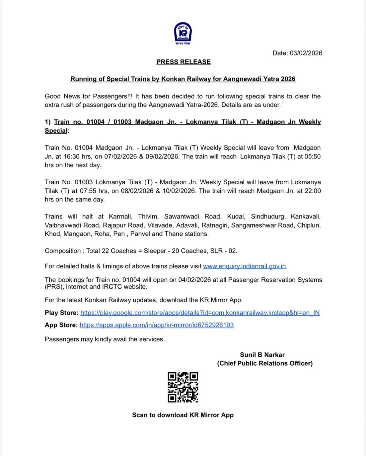 गाडी क्रमांक 01004 साठी आरक्षण ४ फेब्रुवारी २०२६ पासून पीआरएस काऊंटर, इंटरनेट आणि IRCTC वेबसाइटवर खुले होणार आहे. प्रवाशांनी वेळेत आरक्षण करून या सुविधेचा लाभ घ्यावा, असे आवाहन कोकण रेल्वेने केले आहे.