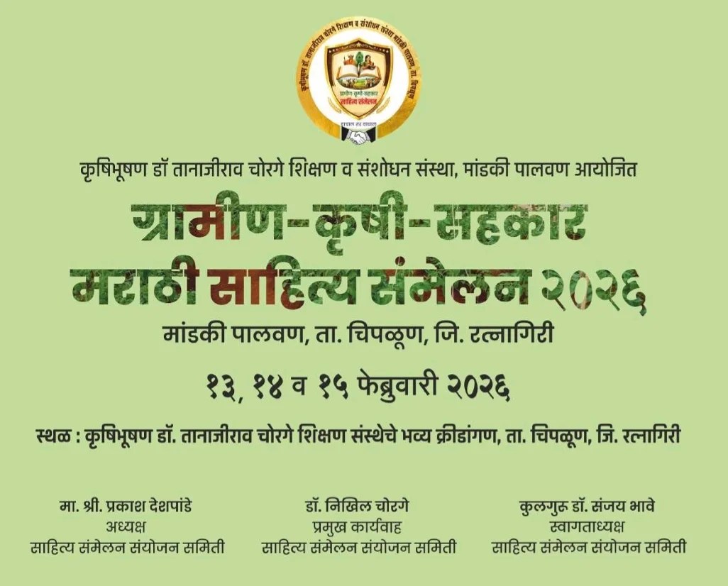 कृषिभूषण डॉ. तानाजीराव चोरगे शिक्षण व संशोधन संस्था, मांडकी पालवण (ता. चिपळूण) यांच्या वतीने दि. १३, १४ व १५ फेब्रुवारी २०२६ रोजी भव्य ग्रामीण, कृषी व सहकार साहित्य संमेलनाचे आयोजन करण्यात आले आहे. या साहित्य संमेलनाचे संमेलनाध्यक्ष कृषीभूषण डॉ. तानाजीराव चोरगे आहेत