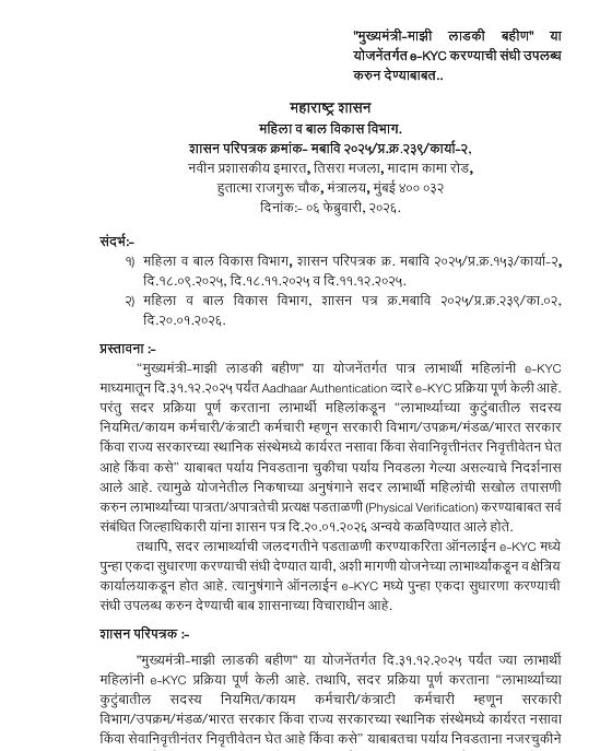 अधिक माहितीसाठी लाभार्थींनी www.maharashtra.gov.in या अधिकृत संकेतस्थळाला भेट द्यावी (सांकेतांक: 202602061212231330). योजनेचा लाभ सुरू राहावा यासाठी पात्र महिलांनी वेळेत ई-केवायसीतील दुरुस्ती करून घ्यावी, असे आवाहन प्रशासनाने केले आहे.