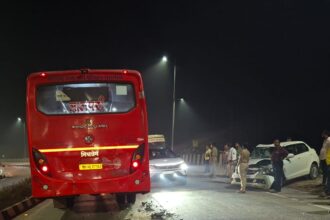 प्राप्त माहितीनुसार, फरशीनाका येथील पुलाजवळून एसटी बस जात असताना कार चालकाने पुढील वाहनाला बाजू काढण्यासाठी अचानक भरधाव वेगात कार वळवली. यावेळी वाहनावरील नियंत्रण सुटल्याने कार थेट समोरून येणाऱ्या एसटी बसवर आदळली. या धडकेत बसच्या हेडलाईटसह समोरील भागाचे मोठे नुकसान झाले असून कारचाही चक्काचूर झाला आहे.