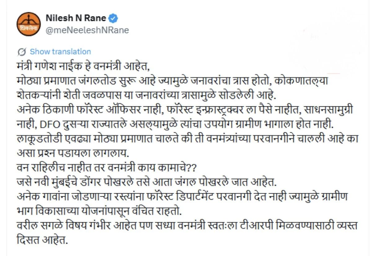 राज्यात मोठ्या प्रमाणात सुरू असलेल्या जंगलतोडीमुळे जंगली जनावरांचा त्रास वाढत असून त्याचा थेट फटका कोकणातील शेतकऱ्यांना बसत आहे. या परिस्थितीमुळे अनेक शेतकऱ्यांनी शेती जवळपास सोडली असल्याचा दावा करत शिवसेना (शिंदे गट) आमदार निलेश राणे यांनी वनमंत्री गणेश नाईक यांच्यावर जोरदार टीका केली आहे. ग्रामीण भाग विकासापासून वंचित राहत असताना वनमंत्री गंभीर प्रश्नांऐवजी टीआरपी मिळवण्यात व्यस्त असल्याचा टोला त्यांनी लगावला.