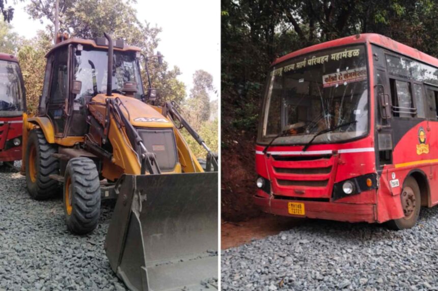 कोंडये मधलीवाडी येथे रस्त्याचे काम सुरू होते. जेसीबी (क्र. एम.एच.०८/बीई/७४७९) द्वारे रस्त्यावर टाकण्यात आलेल्या खडीचे समतलीकरण सुरू असताना एस.टी. बस सुरक्षिततेच्या दृष्टीने रस्त्याच्या कडेला थांबविण्यात आली होती. मात्र, जेसीबी चालकाने मशीन मागे घेत असताना निष्काळजीपणाने एस.टी. बसच्या समोरील भागावर धडक दिली. त्यामुळे बसच्या पुढील भागाचे नुकसान झाले.