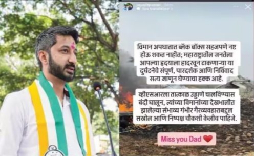 जय पवार यांनी आपल्या पोस्टमध्ये म्हटले आहे की, महाराष्ट्रातील जनतेला या हृदयद्रावक दुर्घटनेचे संपूर्ण, पारदर्शक आणि निर्विवाद सत्य जाणून घेण्याचा अधिकार आहे. तसेच संबंधित VSR विमान कंपनीला तात्काळ उड्डाणे चालवण्यास बंदी घालून त्यांच्या विमानांच्या देखभालीत झालेल्या संभाव्य गंभीर गैरव्यवहाराची सखोल व निष्पक्ष चौकशी झालीच पाहिजे, अशी ठाम मागणी त्यांनी केली आहे.