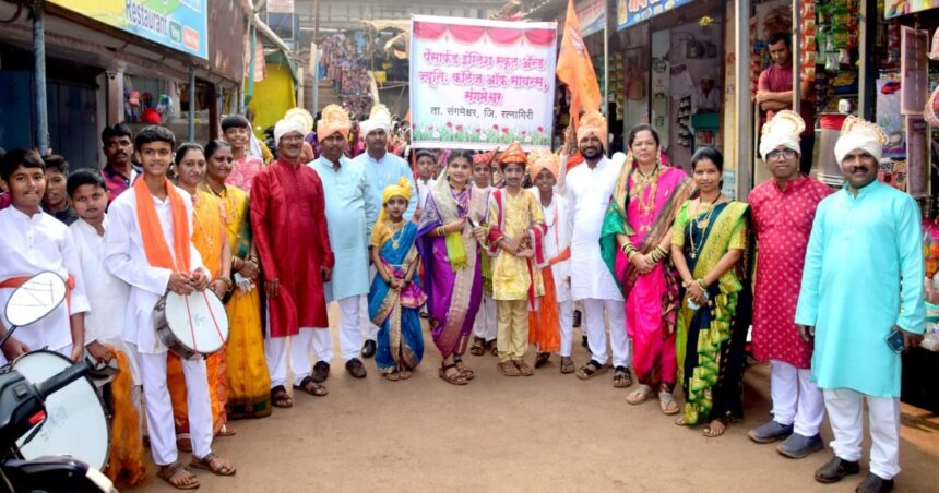 अखंड महाराष्ट्राचे आराध्य दैवत छत्रपती शिवाजी महाराज यांच्या जयंतीनिमित्त संगमेश्वर येथील व्यापारी पैसा फंड संस्थेच्या पैसा फंड इंग्लिश स्कूल आणि कनिष्ठ महाविद्यालयाच्या विद्यार्थ्यांसह प्रशालेतील सर्व कर्मचाऱ्यांनी आज संगमेश्वर बाजारपेठेतून ढोल ताशांच्या गजरात आणि लेझीम नृत्याच्या साथीने शिवजयंती निमित्त भव्य मिरवणूक काढली.