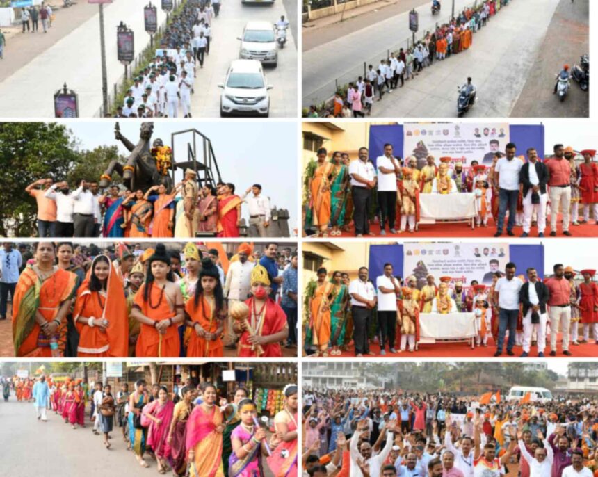 ढोल-ताशांच्या गजरात आणि लेझिमच्या तालावर स्टेडियमपासून निघालेली ही पदयात्रा महाराजांचा जयघोष करत मारुती मंदिर चौकात पोहोचली. विद्यार्थी मोठ्या संख्येने सहभागी झाले होते. बाल शिवाजी, छत्रपती शिवाजी महाराज, राजमाता जिजाऊ, मावळे, कृष्ण, विठ्ठल रखुमाई, प्रभू श्रीरामचंद्र, संत ज्ञानेश्वर, संत तुकाराम आदी संतांच्या वेशातील विद्यार्थ्यांनी सर्वांचे लक्ष वेधून घेतले.