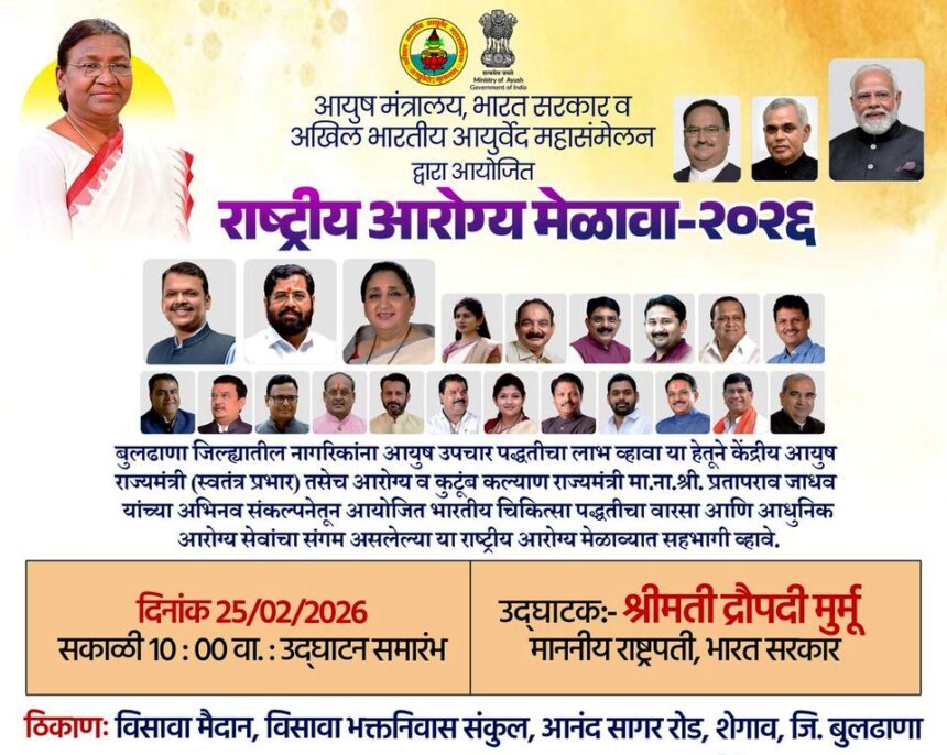 भारत सरकारच्या आयुष मंत्रालय आणि अखिल भारतीय आयुर्वेद महासंमेलन यांच्या संयुक्त विद्यमाने 25 ते 28 फेब्रुवारी 2026 दरम्यान बुलढाणा जिल्ह्यातील शेगाव येथे चार दिवसीय ‘राष्ट्रीय आरोग्य मेळावा 2026’ आयोजित करण्यात आला आहे. औषधी वनस्पती लागवड, कृषी वनीकरण आणि आयुष औषध प्रणालींबाबत जनजागृती करणे, सर्वसमावेशक आरोग्य सेवा देणे आणि शेतकऱ्यांसाठी नवीन उत्पन्नाच्या संधी निर्माण करणे हा या महामेळाव्याचा मुख्य उद्देश आहे.