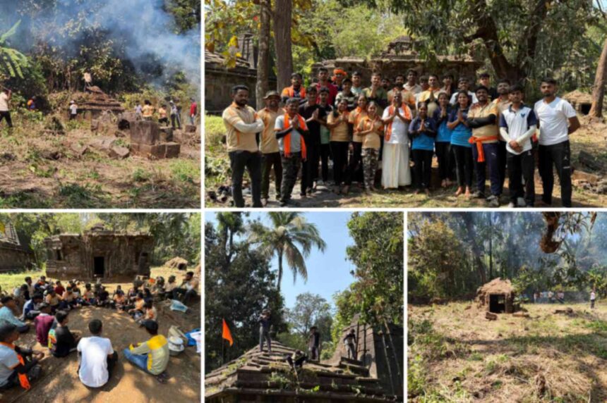 श्रमदान: झाडाझुडपांनी वेढलेली प्राचीन मंदिरे दुर्गवीरांनी स्वच्छ केली. मंदिराच्या छतावर आणि भिंतींवर वाढलेली झुडपे हटवण्यात आली.