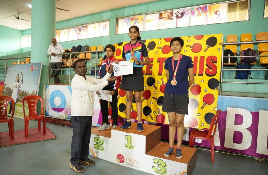 फोटो : टेबल टेनिस स्पर्धेतील विजेत्या खेळाडूंना गौरविताना फुटबॉल असोसिएशन चे पदाधिकारी संतोष म्हस्के