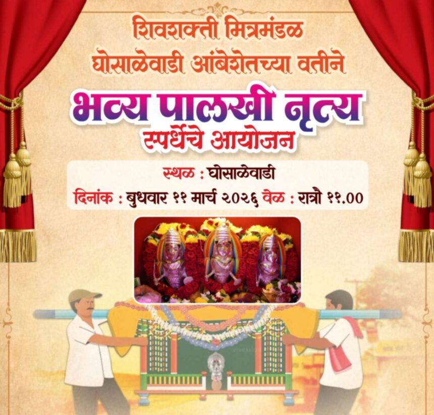 शिवशक्ती मित्रमंडळ, घोसाळेवाडी आंबेशेत यांच्या वतीने घोसाळेवाडी येथे भव्य पालखी नृत्य स्पर्धेचे आयोजन करण्यात आले आहे. ही स्पर्धा बुधवार, ११ मार्च २०२६ रोजी रात्री ११ वाजता होणार असल्याची माहिती आयोजकांकडून देण्यात आली आहे.