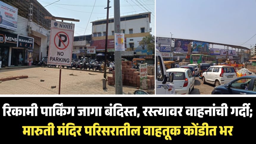 शहरातील मारुती मंदिर परिसरात सुरू असलेल्या रस्त्याच्या कामांमुळे वाहतुकीची कोंडी दिवसेंदिवस वाढत असताना, उपलब्ध पार्किंग जागा असूनही ती वाहनांसाठी खुली न करण्यामागचे कारण काय, असा प्रश्न नागरिकांकडून उपस्थित केला जात आहे. एका बाजूला अर्धा रस्ता बॅरिकेड्स लावून बंदिस्त करण्यात आला आहे, तर दुसऱ्या बाजूला मोकळी जागा *‘नो पार्किंग’*च्या फलकाखाली रिकामीच ठेवण्यात आल्याने वाहनचालकांचा संताप वाढत आहे.