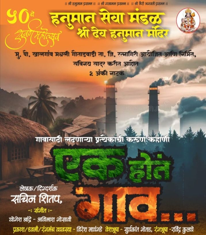 रत्नागिरी तालुक्यातील खालगाव मधील गोताडवाडी येथे येत्या ३ एप्रिल रोजी रात्री १०:३० वाजता एक दर्जेदार नाट्यप्रयोग सादर होणार आहे. हनुमान सेवा मंडळ, श्री देव हनुमान मंदिर यांच्या वतीने आयोजित हनुमान जयंतीच्या ५० व्या सुवर्णमहोत्सवानिमित्त हा विशेष कार्यक्रम होणार आहे. या निमित्ताने रत्नागिरीतील तरवळ गावचे सुपुत्र सचिन शितप लिखित व दिग्दर्शित ‘एक होतं गाव’ हे दोन अंकी नाटक रंगमंचावर सादर केले जाणार आहे.