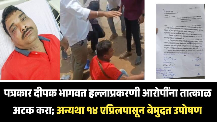 पत्रकार दिपक भागवत यांच्यावर झालेल्या जीवघेण्या हल्ल्याप्रकरणी संबंधित आरोपींना तात्काळ अटक करून कठोर कारवाई करावी, अन्यथा १४ एप्रिल २०२६ पासून चिपळूणमधील पत्रकार बेमुदत उपोषण आंदोलन छेडतील, असा ठाम इशारा पत्रकारांनी उपविभागीय पोलीस अधिकारी प्रकाश बेले यांना दिलेल्या निवेदनातून दिला आहे.