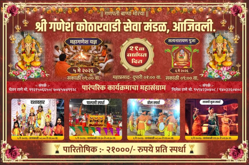 स्थळ: श्री गणेश मंदिर, कोठारवाडी, आजीवली, ता. राजापूर, जि. रत्नागिरी. अधिक माहितीसाठी संपर्क: चेतन राणे – 7045749928, निलेश राणे – 9403260408