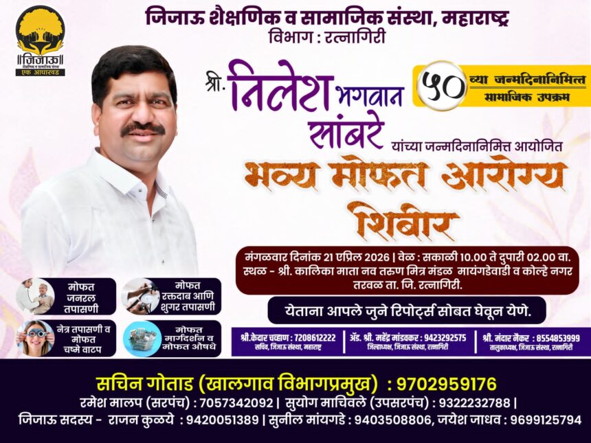 जिजाऊ शैक्षणिक व सामाजिक संस्था, महाराष्ट्र (रत्नागिरी विभाग) यांच्या वतीने संस्थेचे संस्थापक अध्यक्ष निलेश भगवान सांबरे यांच्या ५० व्या वाढदिवसानिमित्त मंगळवार, दिनांक २१ एप्रिल २०२६ रोजी तरवळ (कोल्हेनगर) येथे भव्य मोफत आरोग्य शिबिराचे आयोजन करण्यात आले आहे.