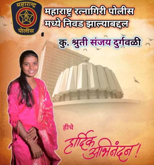 रत्नागिरी तालुक्यातील मालगुंड गावची सुकन्या, दुर्गवळीवाडी येथील रहिवासी श्रुती संजय दुर्गवळी हिची रत्नागिरी जिल्हा पोलीस दलात निवड झाली आहे. अत्यंत प्रतिकूल परिस्थितीतून मार्ग काढत, चिकाटी, मेहनत आणि आत्मविश्वासाच्या जोरावर तिने महिला पोलीस होण्याचे स्वप्न साकार केले आहे. विशेष म्हणजे मालगुंड आग्राडी व दुर्गवळीवाडी परिसरातील ती पहिली महिला पोलीस ठरली असून, तिच्या या यशामुळे संपूर्ण परिसरात आनंदाचे आणि अभिमानाचे वातावरण निर्माण झाले आहे.