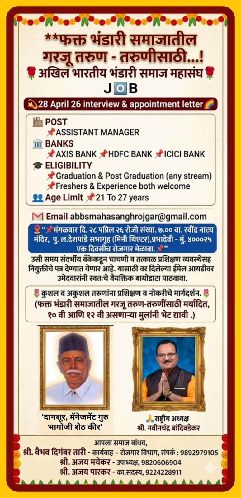 अखिल भारतीय भंडारी समाज महासंघाच्या वतीने भंडारी समाजातील गरजू तरुण-तरुणींसाठी विशेष रोजगार मेळाव्याचे आयोजन करण्यात आले आहे. हा मेळावा मंगळवार, २८ एप्रिल रोजी सायंकाळी ७ वाजता रत्नागिरी येथील रवींद्र नाट्य मंदिर, पु. ल. देशपांडे सभागृह (मिनी थिएटर), प्रभादेवी, मुंबई येथे पार पडणार आहे.