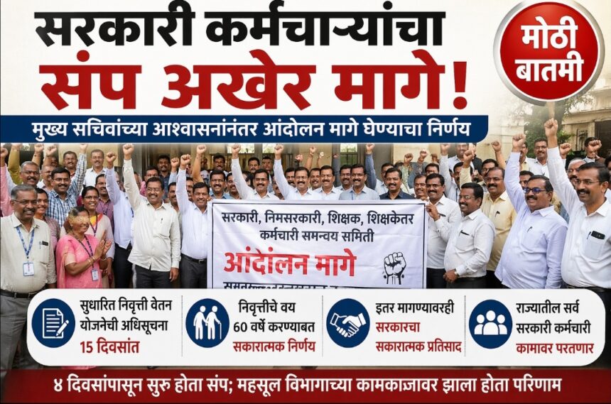 सुधारित निवृत्ती वेतन योजना आणि इतर १८ मागण्यांसाठी राज्यभरातील सरकारी कर्मचाऱ्यांनी पुकारलेला संप अखेर मागे घेण्यात आला आहे. मुख्य सचिव राजेश अग्रवाल यांच्यासोबत झालेल्या निर्णायक बैठकीनंतर सरकारने दिलेल्या आश्वासनांचे अधिकृत इतिवृत्त मिळाल्यानंतर हा निर्णय जाहीर करण्यात आला.