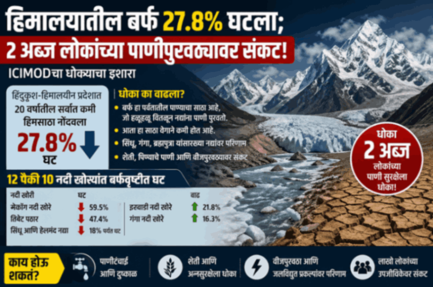 इंटरनॅशनल सेंटर फॉर इंटिग्रेटेड माउंटन डेव्हलपमेंट (ICIMOD) च्या ताज्या अहवालाने जगभरात चिंता वाढवली आहे. हिमालयीन प्रदेशातील बर्फवृष्टीत 27.8 टक्क्यांची घट नोंदवली गेली असून, याचा थेट परिणाम आशियातील जलस्रोतांवर होण्याची शक्यता आहे. या बदलामुळे सुमारे 2 अब्ज लोकांच्या पाणी सुरक्षेला धोका निर्माण झाल्याचा इशारा देण्यात आला आहे.