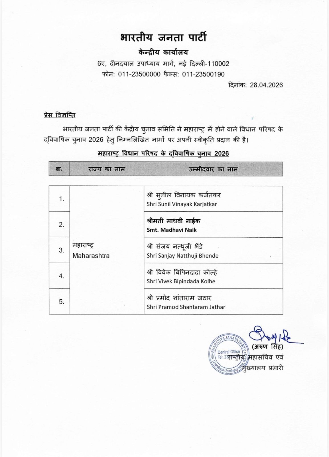 १२ मे रोजी होणाऱ्या विधान परिषद निवडणुकीसाठी भाजपाने आपल्या पाच उमेदवारांची घोषणा केली आहे. पक्षाने प्रमोद जठार, संजय भेंडे, माधवी नाईक, विवेक कोल्हे आणि प्रज्ञा सातव यांना उमेदवारी दिली आहे. या घोषणेनंतर राज्यातील राजकीय हालचालींना वेग आला आहे.