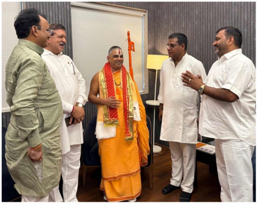 उदयपूरमध्ये जगद्गुरु रामानंदाचार्य नरेंद्राचार्यजी यांचे आशीर्वाद घेताना राजस्थानचे उपमुख्यमंत्री प्रेम चंद भैरवा, शेजारी उदय लाल डांगी, रत्नागिरीतील अरिहंत ग्रुपचे सुरेशशेठ गुंदेचा