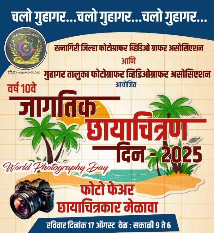 फोटोग्राफर बंधू वर्षभर ज्या दिवसाची वाट मोठ्या आतुरतेने बघतअसतात, तो दिवस म्हणजे जागतिक छायाचित्रण दिन. रत्नागिरी जिल्हा फोटोग्राफर व्हिडिओ ग्राफर असोसिएशनच्या वतीने दरवर्षी जिल्ह्यातील वेगवेगळ्या तालुक्याचे ठिकाणी 17 ऑगस्ट रोजी दरवर्षी मोठ्या उत्साहात जागतिक छायाचित्रण दिन साजरा केला जातो. जिल्हा फोटोग्राफर असोसिएशनचं जागतिक छायाचित्र दिन साजरा करण्याचे हे दहावे वर्ष आहे. यावर्षी जागतिक छायाचित्र दिन अर्थात वर्ल्ड फोटोग्राफी डे चा हा कार्यक्रम रविवार दि 17ऑगस्ट 2025 रोजी स.9 ते सायं.6 वाजे पर्यत गुहागर तालुका असोसिएशनच्या वतीने गुहागर शहरातील भंडारी हॉल येथे मोठ्या दिमाखात साजरा होत आहे.