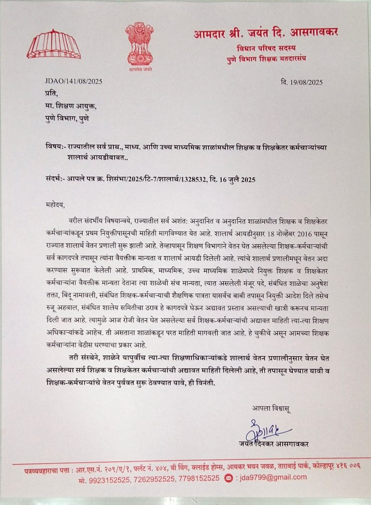 पुणे विभाग शिक्षक मतदारसंघाचे विधान परिषद सदस्य जयंत आसगावकर यांनी म्हटले की, शाळांनी यापूर्वीच शालार्थ प्रणालीद्वारे सर्व माहिती सादर केली आहे. त्यामुळे तीच माहिती शिक्षण विभागाने तपासून घ्यावी आणि शिक्षक-कर्मचाऱ्यांचे वेतन कोणतीही अडचण न आणता पूर्ववत सुरू ठेवावे, अशी स्पष्ट मागणी त्यांनी केली आहे.